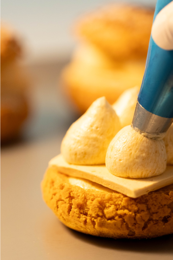 バター好きな方に、ぜひ食べていただきたいクッキーシュークリームです。サクサクのクッキー生地に、発酵バターを贅沢に使ったクリームをたっぷり。さらにカットバターを挟み込んで、風味豊かに仕上げています。これまでのシュークリームの概念を覆すオリジナリティにあふれた一品です。